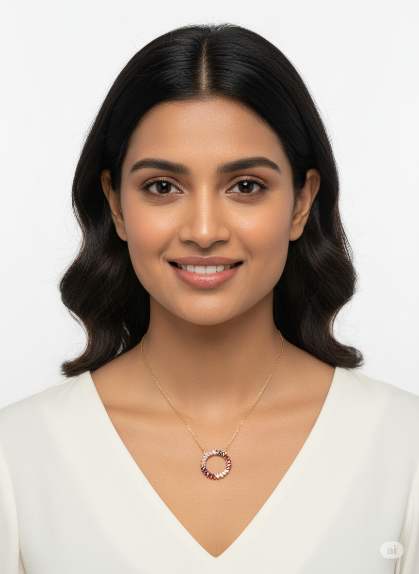 This striking gold-plated pendant features a vibrant circle of dazzling multi-colored gemstones, surrounded by brilliant clear stones. It's a fun yet elegant piece, perfect for adding a pop of life and personality to any outfit, any day.