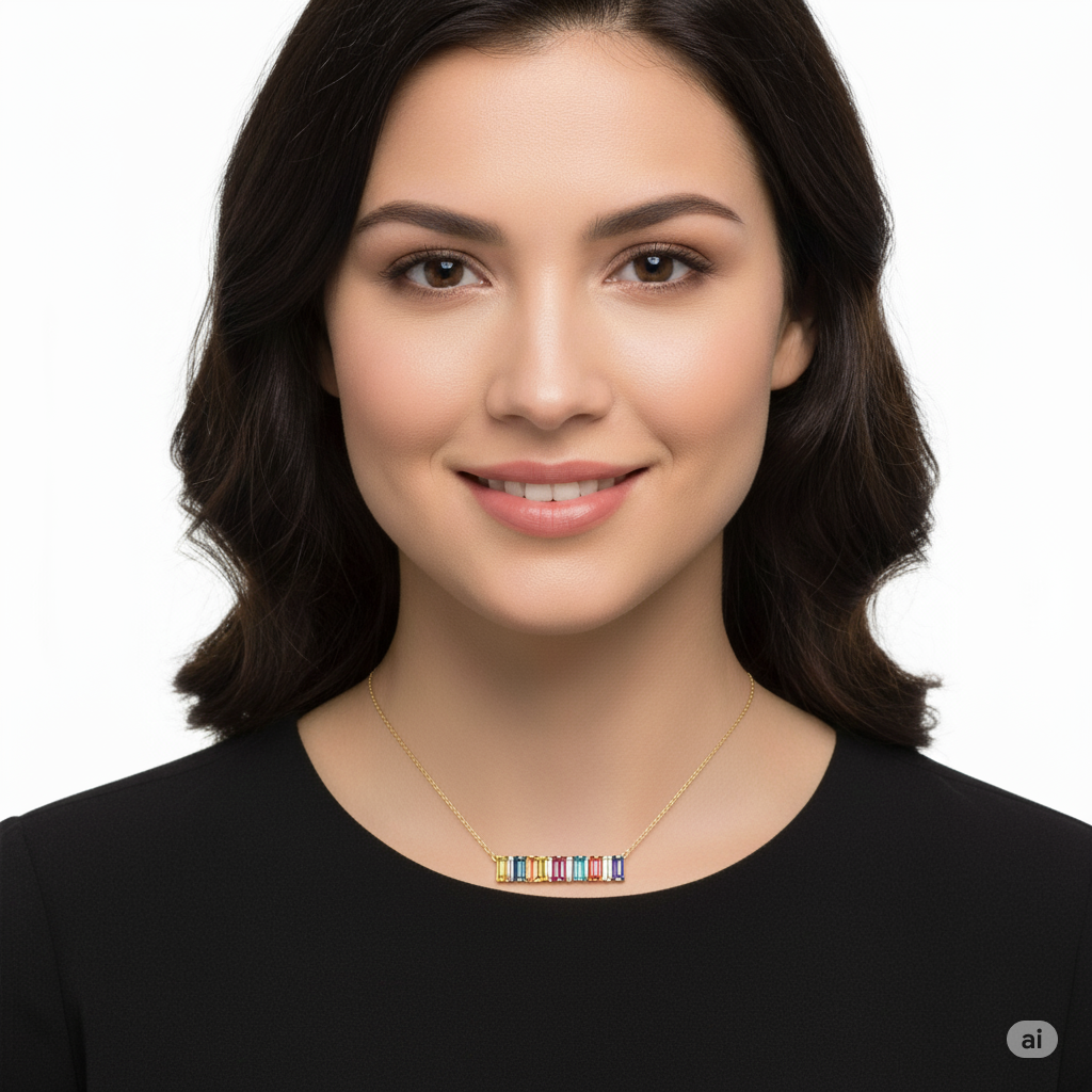This modern gold-plated pendant features a chic bar design lined with vibrant, sparkling multi-colored baguette stones. It's the perfect contemporary accessory to add a sophisticated pop of color and brilliance to your everyday style or layered look.